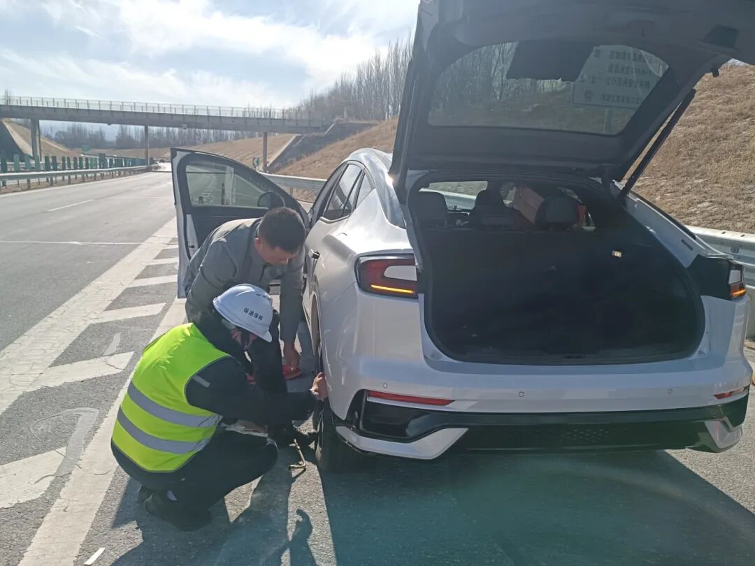 2月16日中午,大队巡查至宣大高速 K204+500 处,发现一辆白色私家车停靠应急车道,车主一家神色焦急。经询问,该车右后轮胎破损漏气。巡查人员立即做好安全预警,一边疏导过往车辆,一边熟练拆卸故障轮胎、更换备胎,短短十几分钟便完成操作。考虑到备胎不适合长途行驶,工作人员又指引其前往就近维修厂修复破损轮胎,确保车辆正常通行。