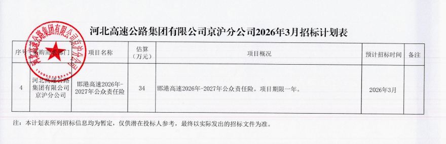 河北高速公路集团有限公司京沪分公司2026年3月招标计划表
