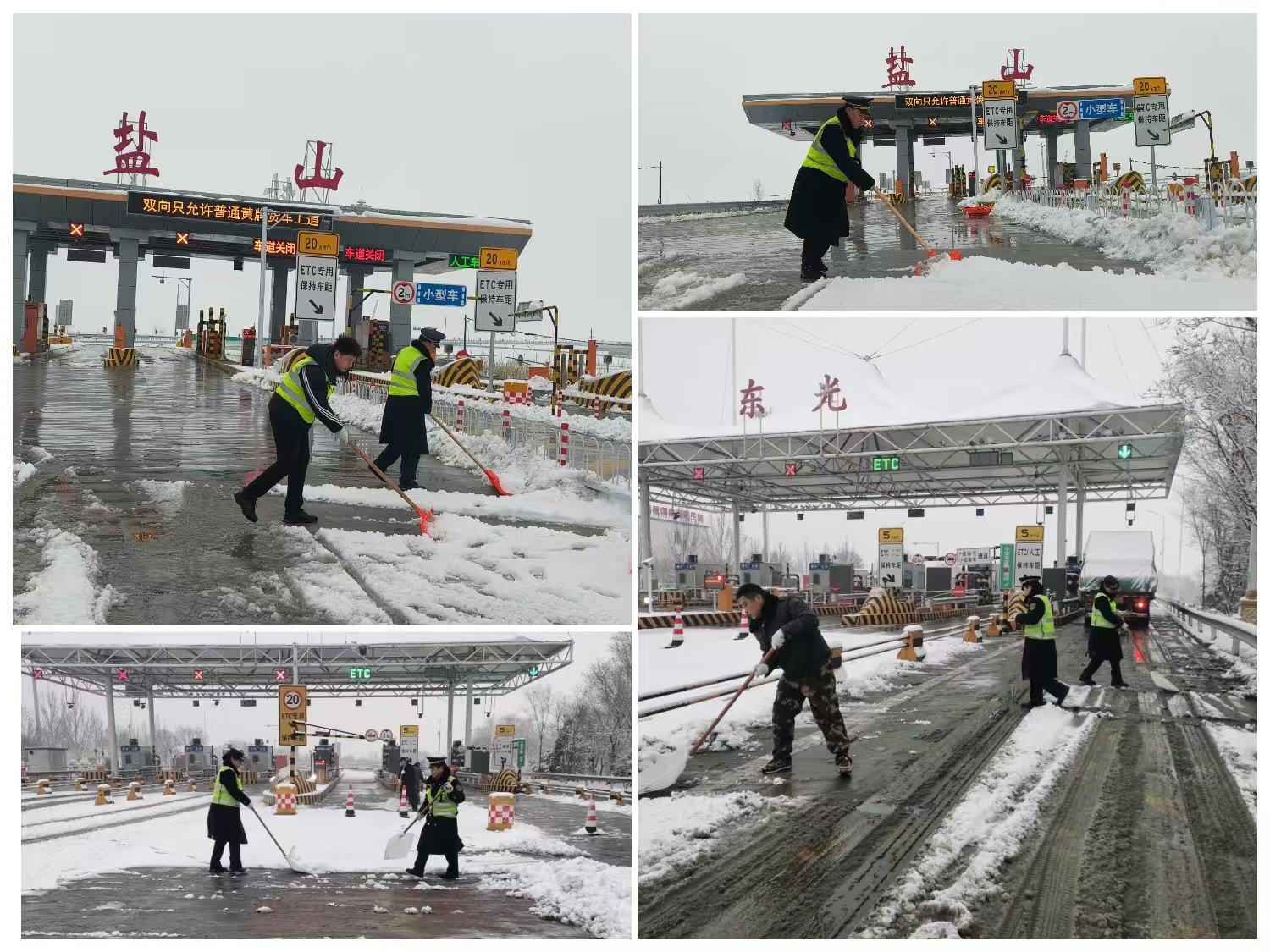 面对降雪,两站坚持“岗上不停、随下随清”。一线收费人员坚守岗位,加密巡查频次,对收费车道、安全岛、窗口区域循环清理,确保车辆通行路面无积雪、不结冰,收费服务不间断。