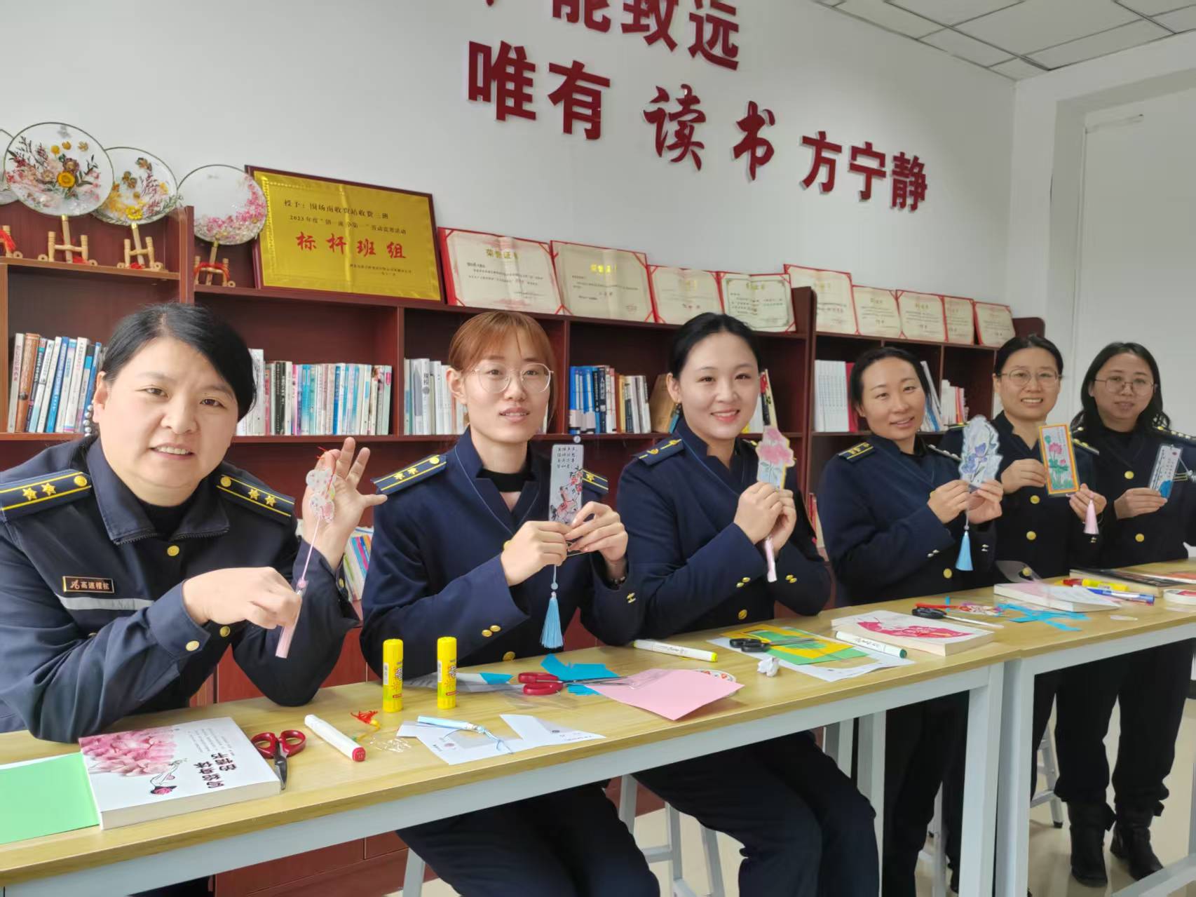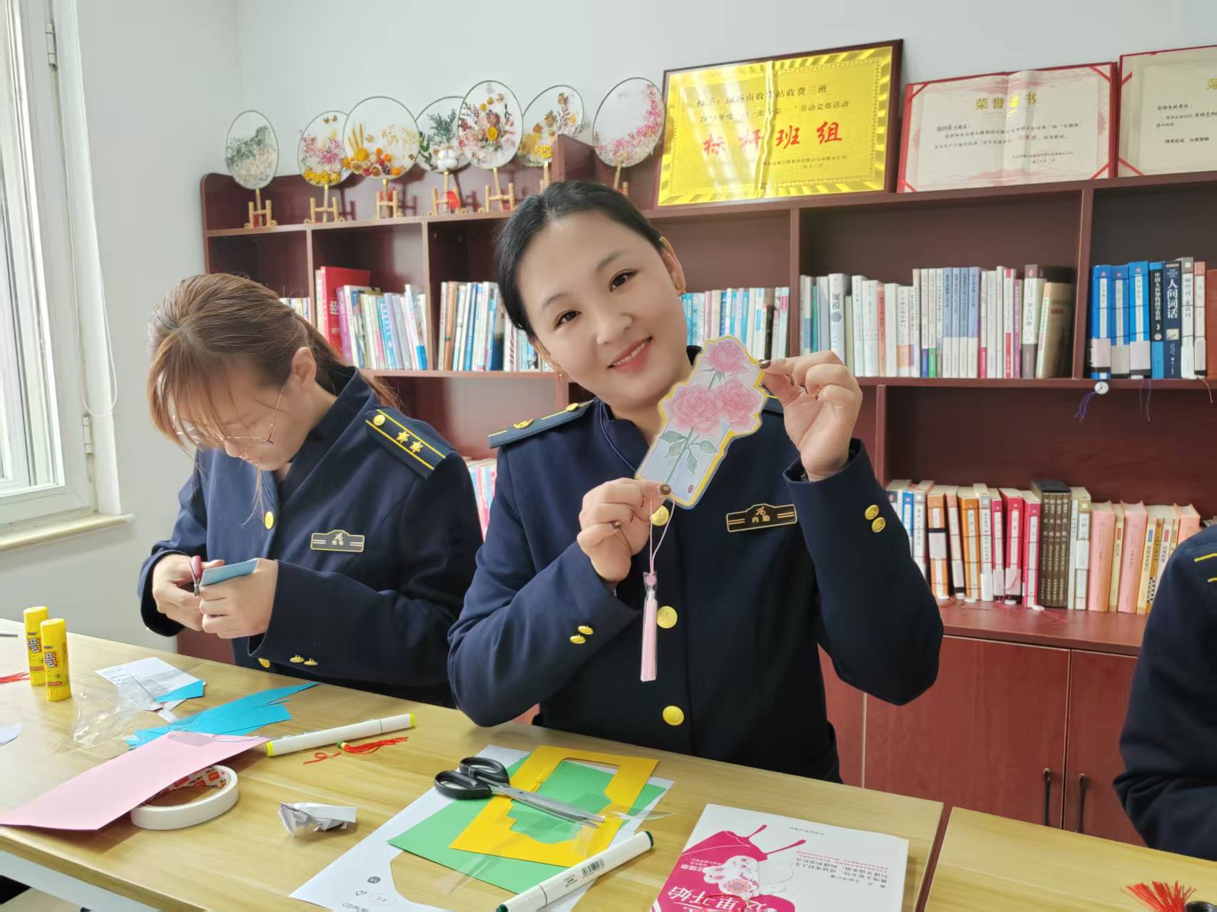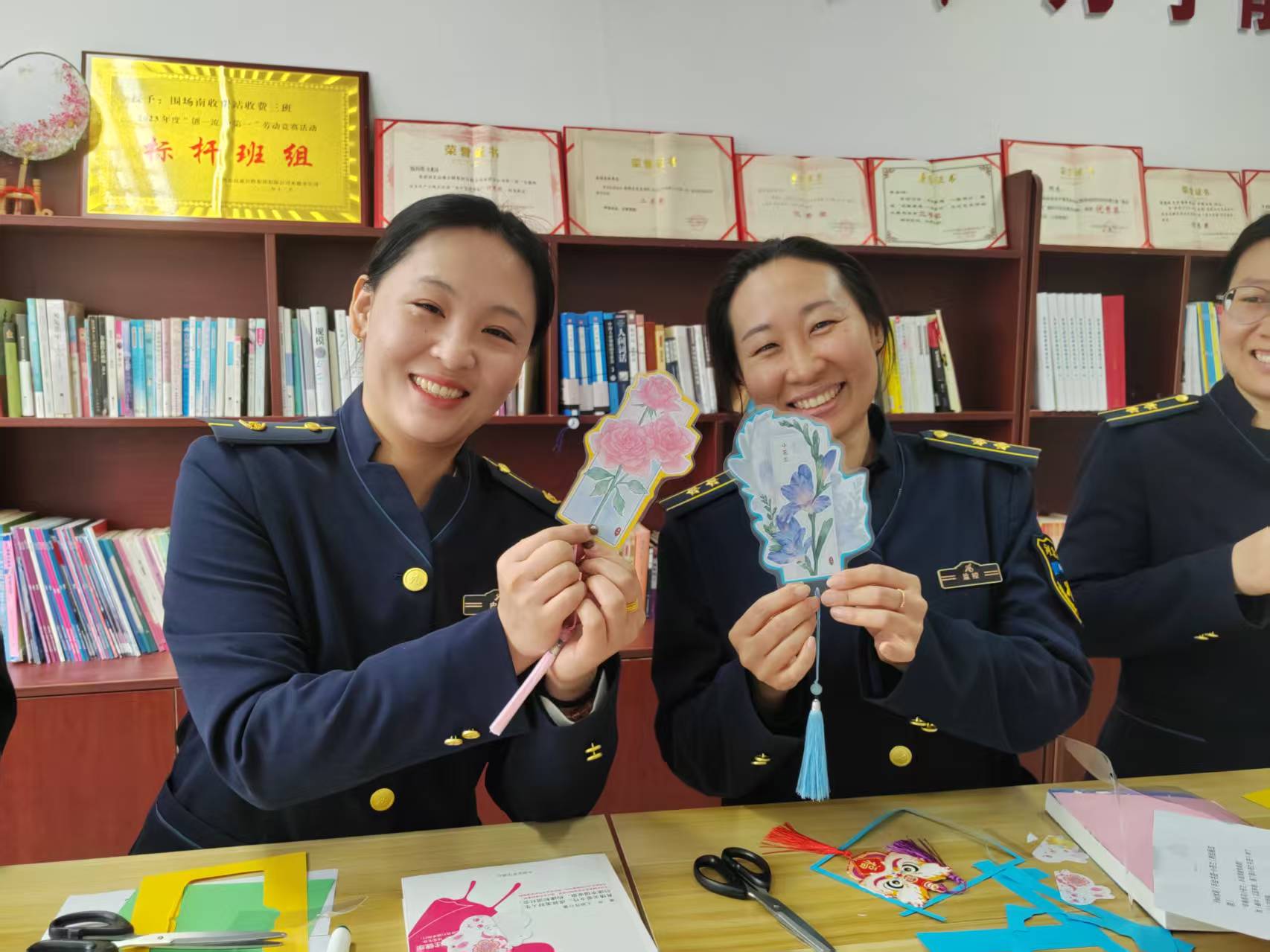 随后,手工制作书签活动拉开帷幕。大家围坐在一起,手持材料,充分发挥想象力与创造力,裁剪、搭配、装饰,小心翼翼地制作专属自己的书签。现场欢声笑语不断,大家互相交流技巧、分享创意,在指尖的灵动中感受手工创作的乐趣,一张张精致独特的书签陆续诞生,既承载着对阅读的热爱,也定格了节日的美好。