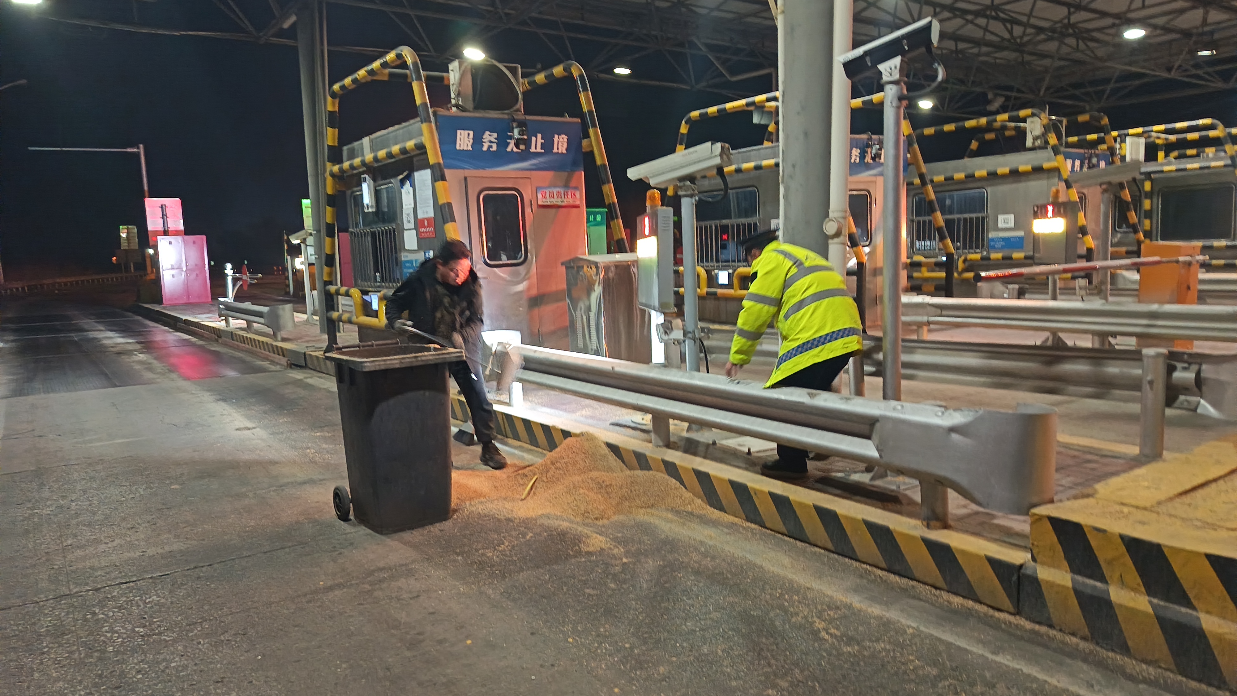 司机此时才惊觉货物散落。经了解,该车因货物较轻、捆绑绳索松动,行驶中货物发生倾斜,剐蹭到收费岗亭防撞柱,致使大量麸皮散落。赵峰迅速关闭故障车道、开启备用车道。随后,他主动与司机一同清理车道及广场内散落的麸皮,又协助司机重新绑扎、固定货物,消除行车安全隐患。司机师傅对南皮站工作人员的及时相助连连道谢。
