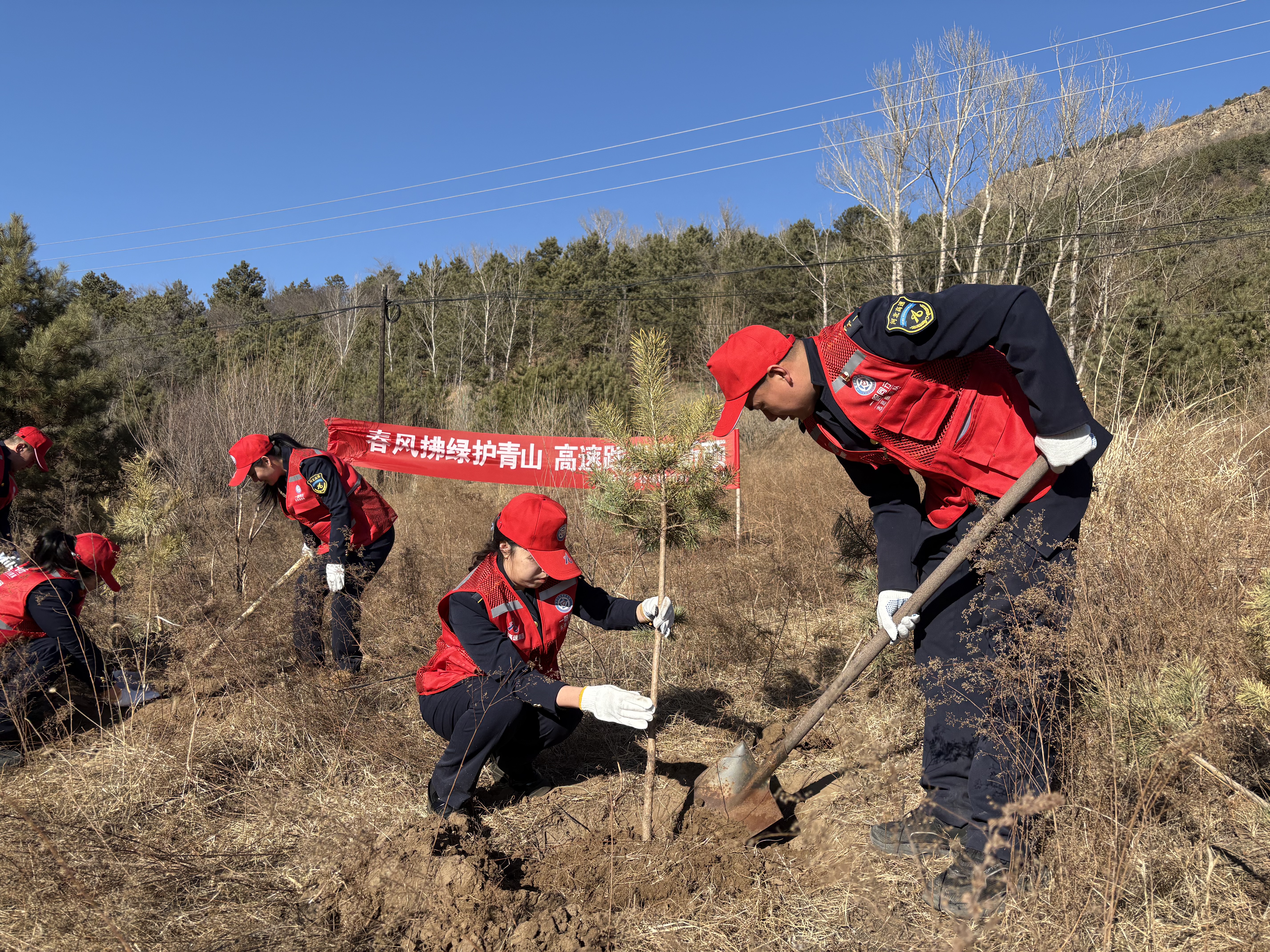 在2026年植树节来临之际,承德分公司围场南收费站党支部积极响应义务植树号召,组建志愿服务队前往周边山上开展“春风拂绿 共护青山”主题植树活动,以实际行动践行生态文明理念,结合木兰围场地域特点,树牢社会责任担当,为筑牢区域生态屏障贡献高速力量。