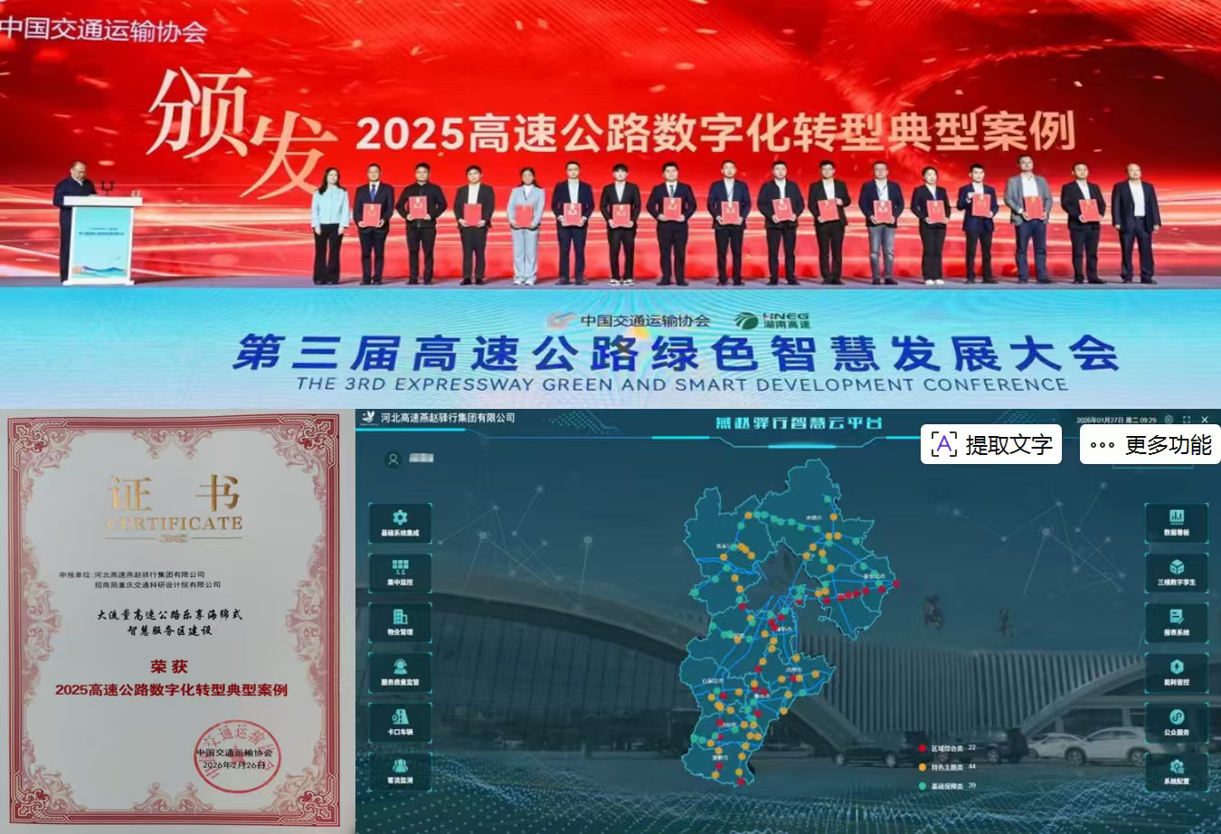 3月14日,在中国交通运输协会主办的第三届高速公路绿色智慧发展大会上,河北高速燕赵驿行集团申报的《大流量高速公路乐享海绵式智慧服务区建设》案例,成功获评“2025高速公路数字化转型典型案例”,为河北高速服务区数智化升级提供了示范标杆样本。