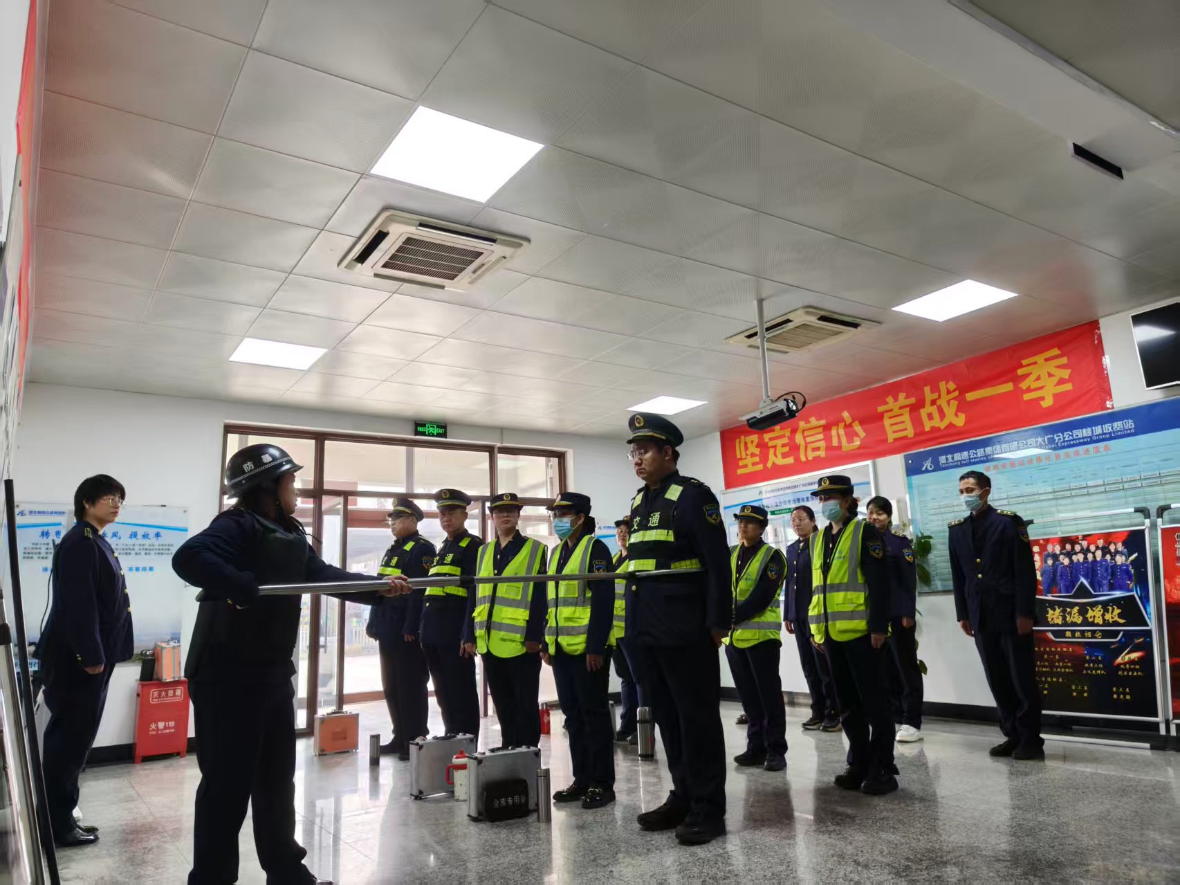 为切实提升突发事件的应急处置能力,强化职工安全防范意识,筑牢收费一线安全防线,3月24日,桃城收费站组织开展防盗抢应急实战演练。