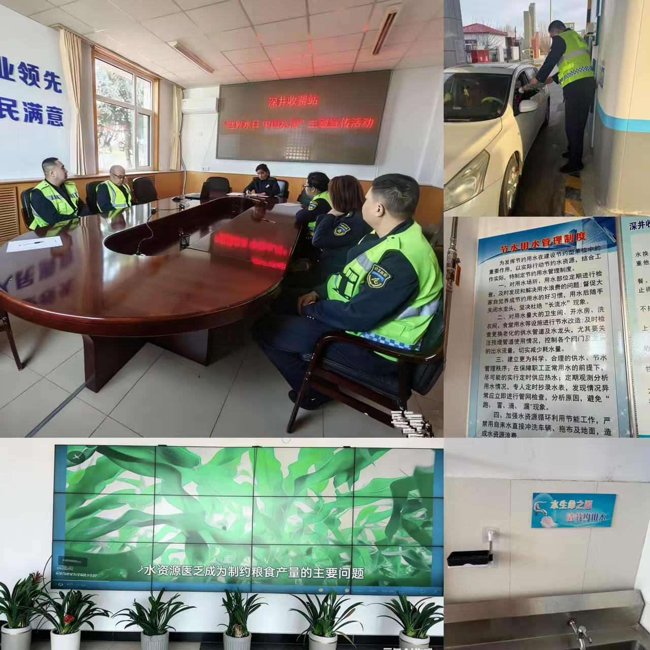 站区通过LED屏滚动播放宣传标语、张贴节水提示、发放宣传资料等形式,向职工及过往司乘普及《节约用水条例》,宣传节水知识与国家水网建设重要意义,倡导饮水思源、节水优先理念。站内“一路同行”志愿服务队在收费广场设立宣传咨询台,开展现场宣讲,引导大家从身边小事做起,倡导“随手关水、一水多用”,引导司乘自觉践行绿色出行、节约用水。在卫生间、厨房、水泵房等重点区域张贴节水提示,排查并修复漏水点,杜绝“跑冒滴漏”。