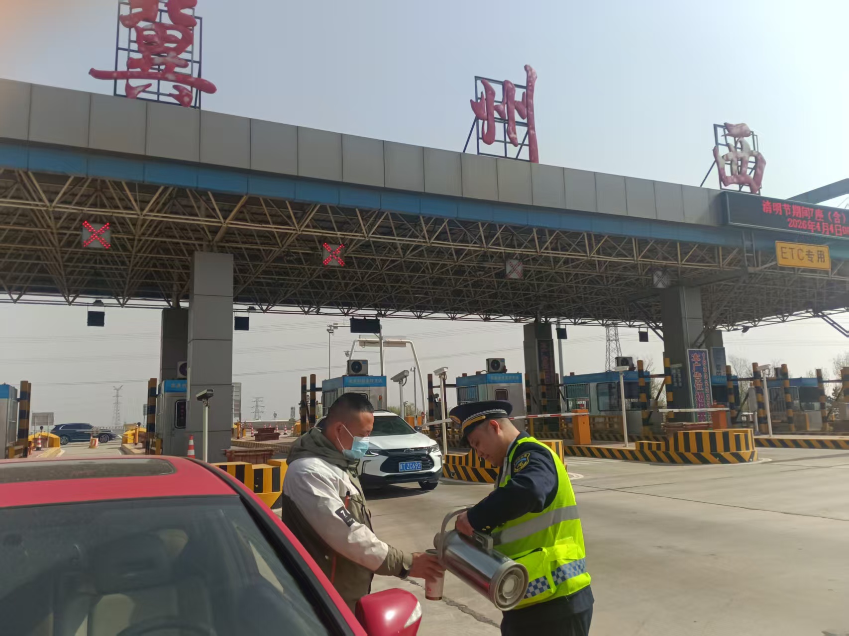 4月5日,清明节当天,返乡祭扫与踏青出游的车流汇聚,冀州西收费站再次迎来通行高峰。为给旅途劳顿的司乘朋友送去一份温暖与关怀,我们积极践行延伸服务理念,在全力保障道口畅通的同时,贴心地为司乘准备了热水服务。