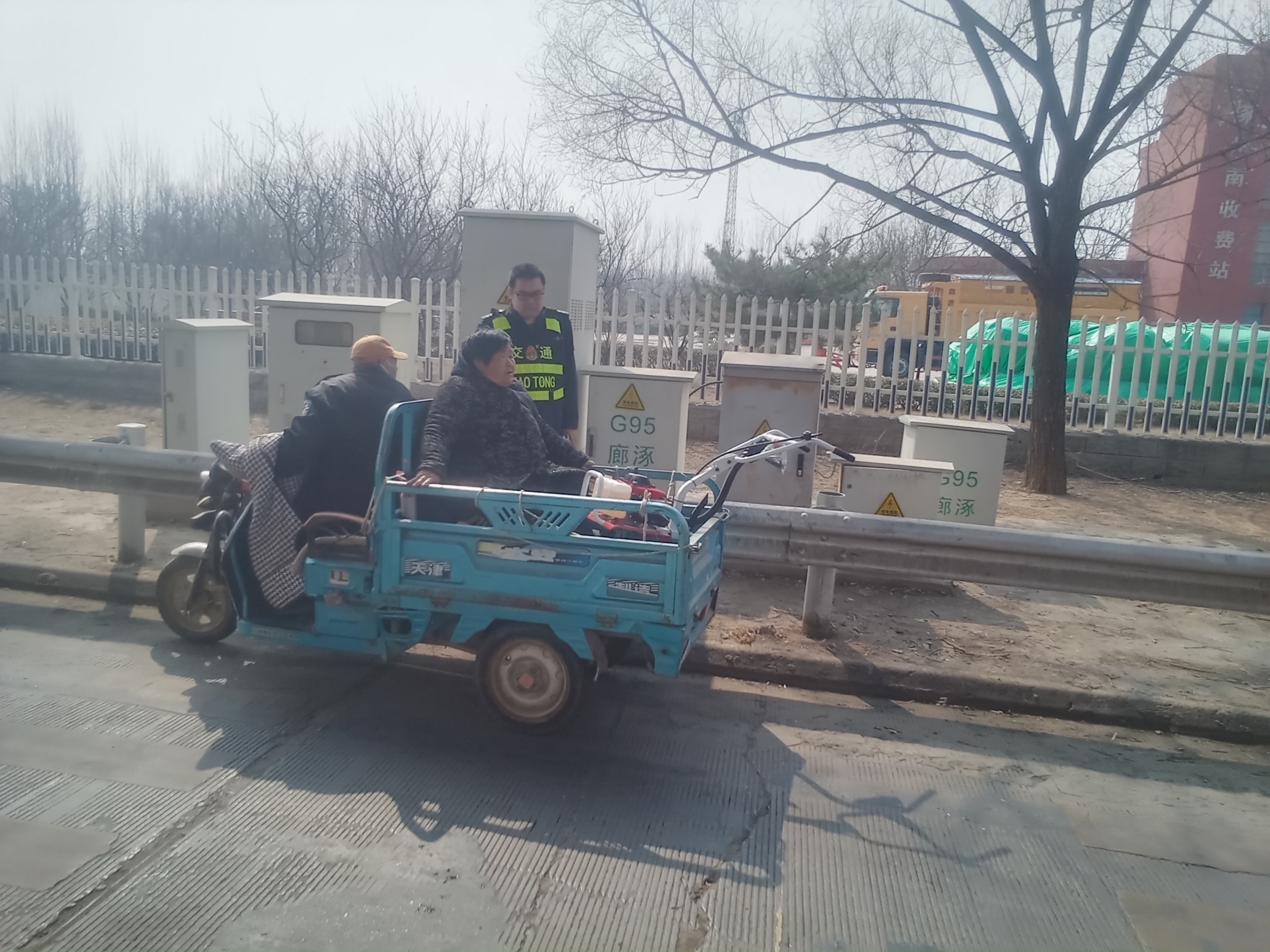 4月8日下午,在涿州南收费站入口,两位老人骑着电动三轮车准备驶入高速公路,被当班工作人员及时发现并上前劝阻。