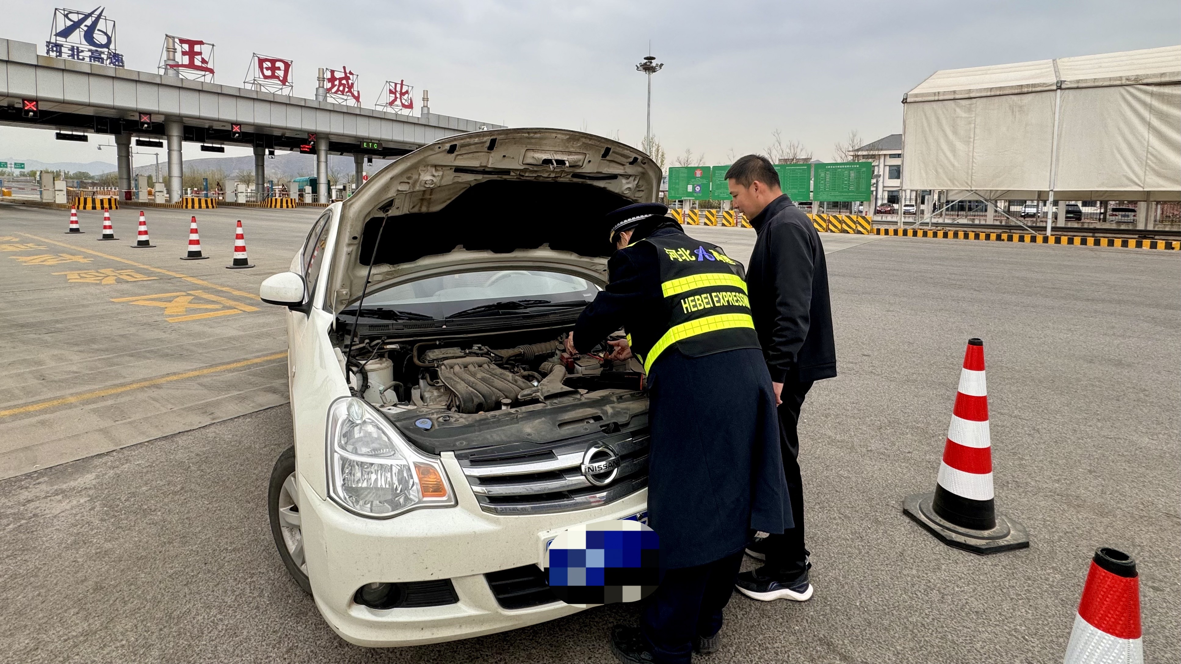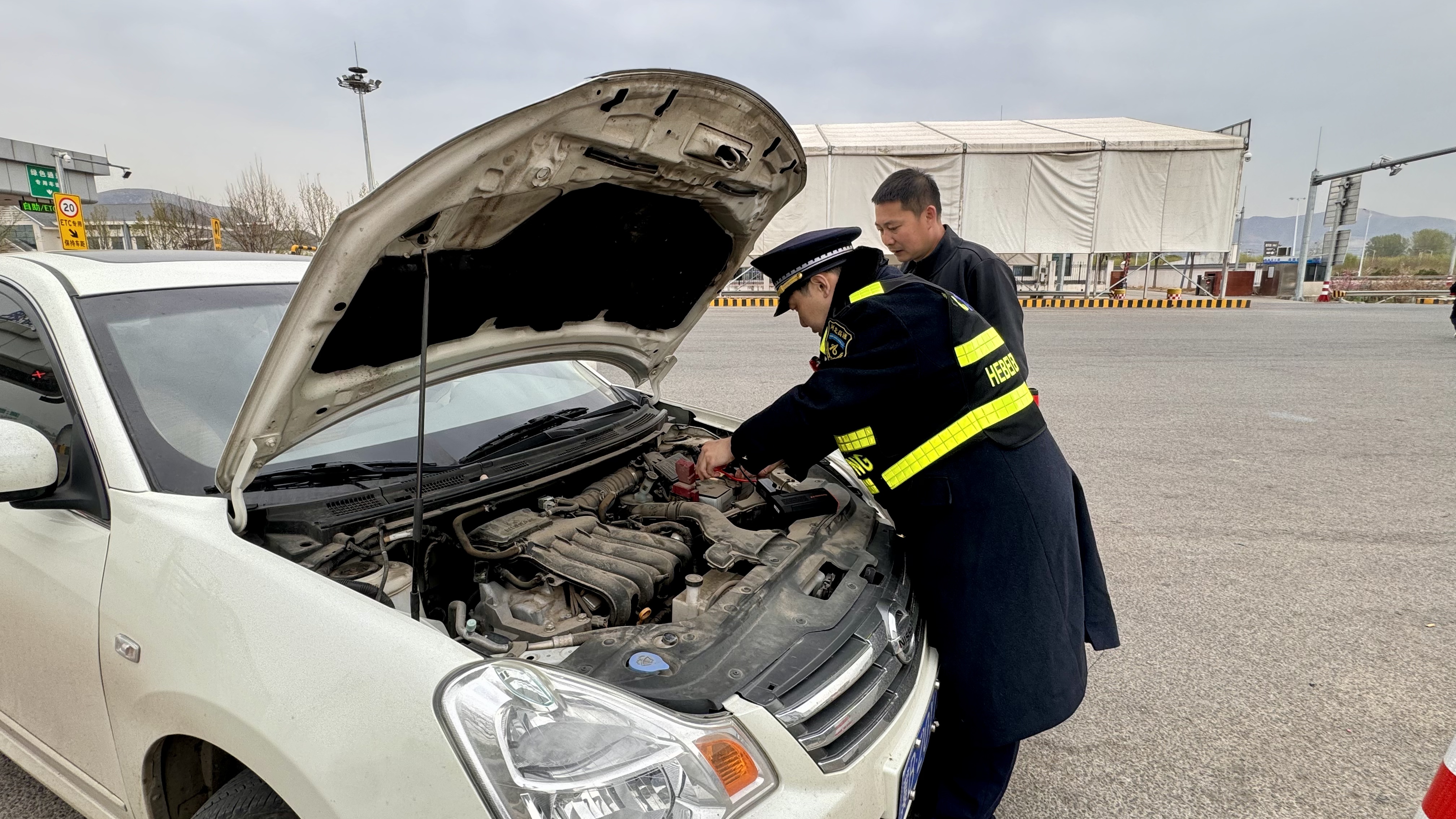 4月14日,一辆小客车在玉田城北收费站出站口突发故障,无法正常打火启动,车主焦急地找到收费站工作人员求助。