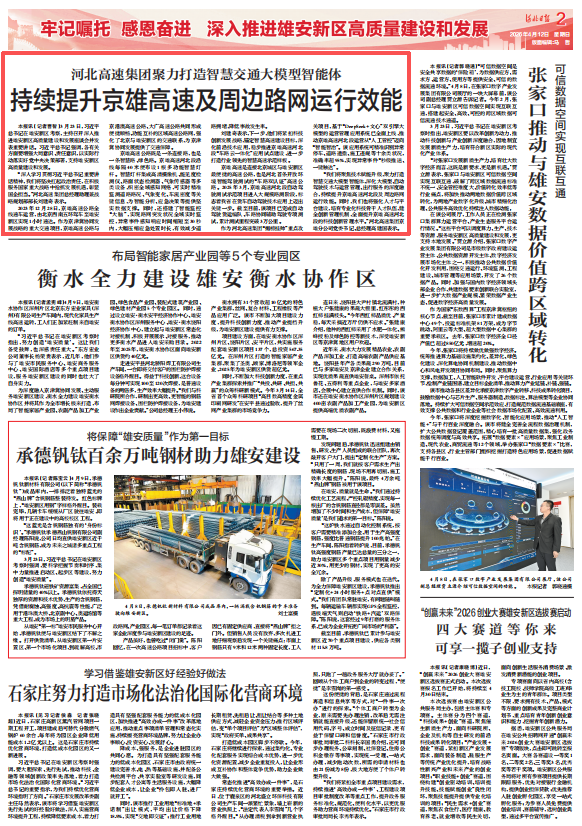 近日,河北日报02版刊登题为“河北高速集团聚力打造智慧交通大模型智能体 持续提升京雄高速及周边路网运行效能 ”的文章,报道了河北高速集团以科技创新赋能京雄高速。