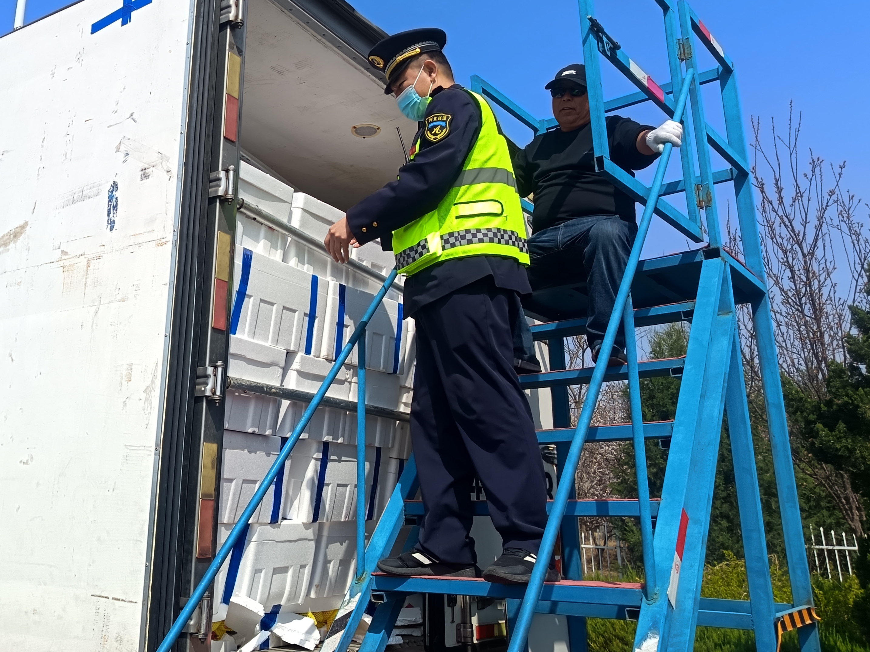 了解情况后,张玉松完成查验工作后主动伸出援手,他爬上验货梯,和司机配合着将散落的桃箱逐一搬下,仔细检查果品完好情况,随后重新装箱、装车、固定,保障了运输安全。整个过程张玉松忙得满头大汗,司机深受感动,连声道谢。
