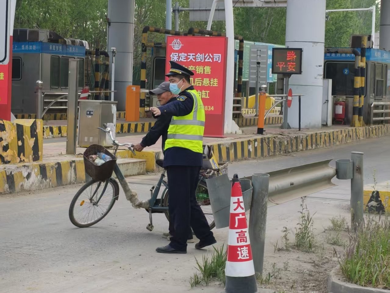 4月14日下午,大广分公司高阳收费站上演了一幕既暖心又惊险的场景。一名老人骑车闯入收费车道,面对工作人员的口头制止未予理睬。见此情形,发卡员立即上报当班班长,疏导员迅速在现场开展车辆疏导工作,班长则火速追赶老人。经耐心沟通得知,老人是附近村民,为补贴家用才冒险进入高速管控区域捡拾塑料瓶。工作人员没有丝毫指责,而是暖心安抚老人情绪,全程陪同他缓步撤离至安全地带。途中,工作人员还主动帮忙捡拾散落的瓶罐,并贴心表示后续打扫卫生收集的塑料瓶会单独留给老人。