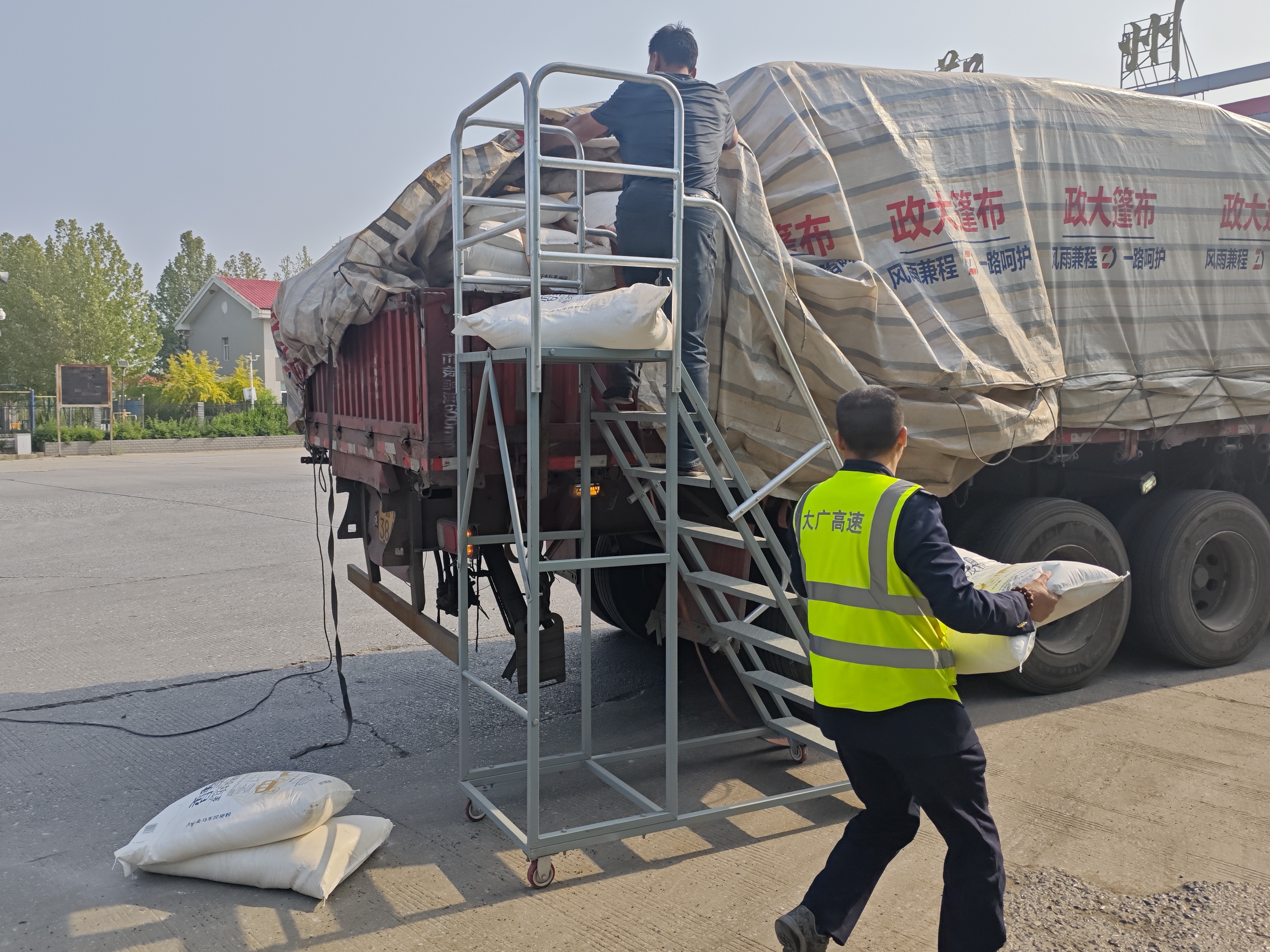 4月23日,一辆装载面粉的货车在行驶至鄚州收费站入口广场时,因篷布捆绑不牢固,多袋面粉散落至地面,影响了站口正常通行秩序,还存在一定安全隐患。